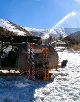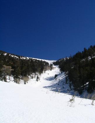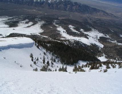 | Have had quite a few big days lately seeking out new descents to go with new skis. It's very fun living and skiing here as most of the new descents we do are first descents. From what I can gather this was another one Here's a few photos from a good day. To start with Liz and I finally skied the Dog Leg of Snake Canyon that we've eyeballed for years. Hard to believe it took this long to get to skiing this one. It's 2,200 feet long of mostly 25 to 30 degrees in pitch with the top section being steeper. Conditions were variable, from hard pack to wind buff soft snow. It was great fun all the same. A nice mellow tour up. Traveling the ridge before us was a mountain lion, never saw the critter and the tracks were older. The view down the intended descent. Some pictures from along the way. Had to bask in the sun for a bit at the bottom. The skin up and out was fun and at times interesting as we hadn't got wall to wall skins for our new skis yet. (this climb had us ordering some that night) The last section demanded that we boot up and over the small cornice in order to 'shortcut' our route back. The exit off the mountain was another good descent of 2,500 feet but the shadows overtook the day and we had skied that route many times so on this day we just skied it taking no photos. The pictures probably don't reflect what a fun March day it was but we had to try to capture it. |