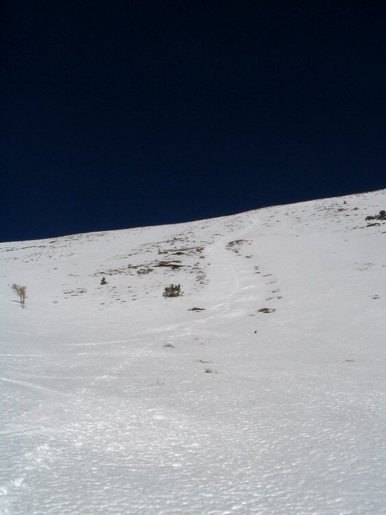 I've had to get used to skiing without Lee since he broke his leg earlier in the season. It's been a change back to the days before he moved here. Good solo days are still good days even if the only one who shares the moment with you only wags their tail after a good line. On a beautiful January Saturday I decided to take advantage of the warm weather and ski some corn fields on North Schell Peak. Sure there's not the base there that there is on other slopes but the rocks are either well buried under the surface or readily apparent. This gully off North Schell always provides some good fun on a sunny corn day even if it is in the middle of winter. It's a good 1,000 feet of 30 to 35 degree slope for turns on the top half and another 1,000 feet of 20 to 25 degree slope on the lower half. |