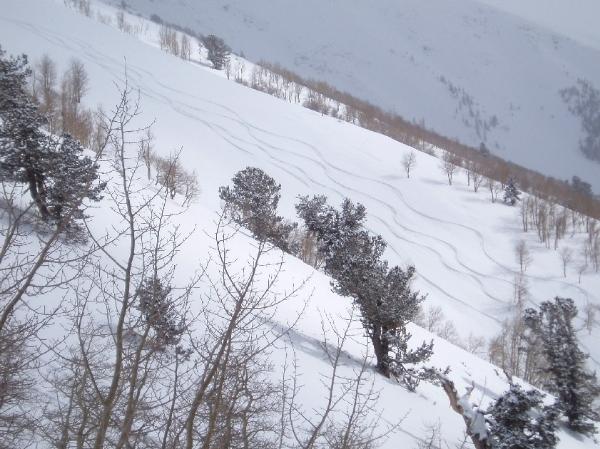 | Sunday – Sue Kennedy joined us for a nice tour into N. Fork of Timber, Mainstreet, Weavers Bane, and the Aspen bowl just south of Weavers Bane. We did 3 big laps in very nice powder, over 5000 vertical feet |